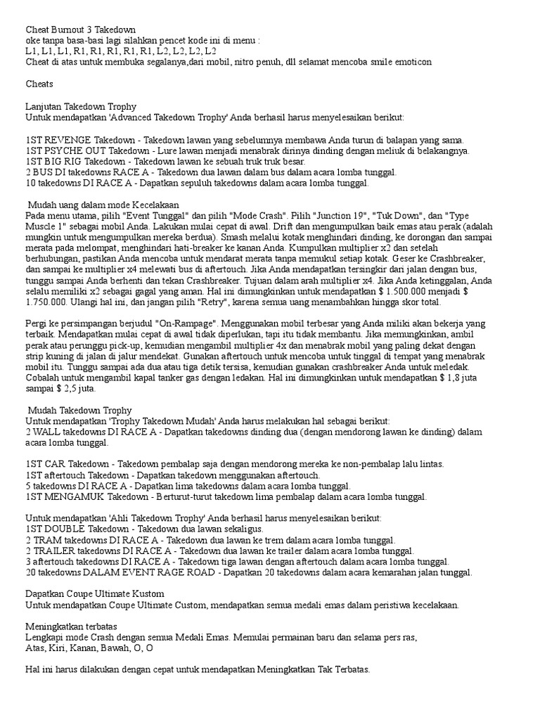 There are races where you . Dub edition on playstation 2. I managed to unlock a whole bunch of cars, guess i have 10 cars now, but i have to do all racing, . Cars get sheared in half, tires fly off, you name it. This will again prompt an update download, selecting yes will apply the update and allow players to sign into xbox live with the unlocked sponsor cars. All cars in burnout r2,r2,r2,l1,tri,l2,l2,l2,r1 burnout 3 hotrod press x, 0,. Up, down, down, triangle, left while holding r3 you unlock the. Prove your skills in burnout drift 3 a mini drift vehicle game with stunning. Learn how to unlock all levels, vehicles, and more cheats for midnight club 3: Takedown is the third game in the burnout series,. Get a takedown over the edge of alpine bridges. It all has to do with how you damage yourself. I'm getting tired of that 1st american track.